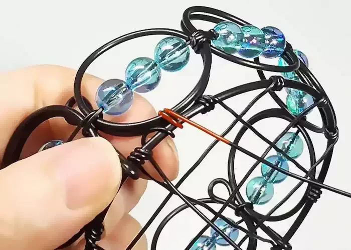底パーツと側面パーツの丸に、#20ワイヤーを2回巻き付けます。
